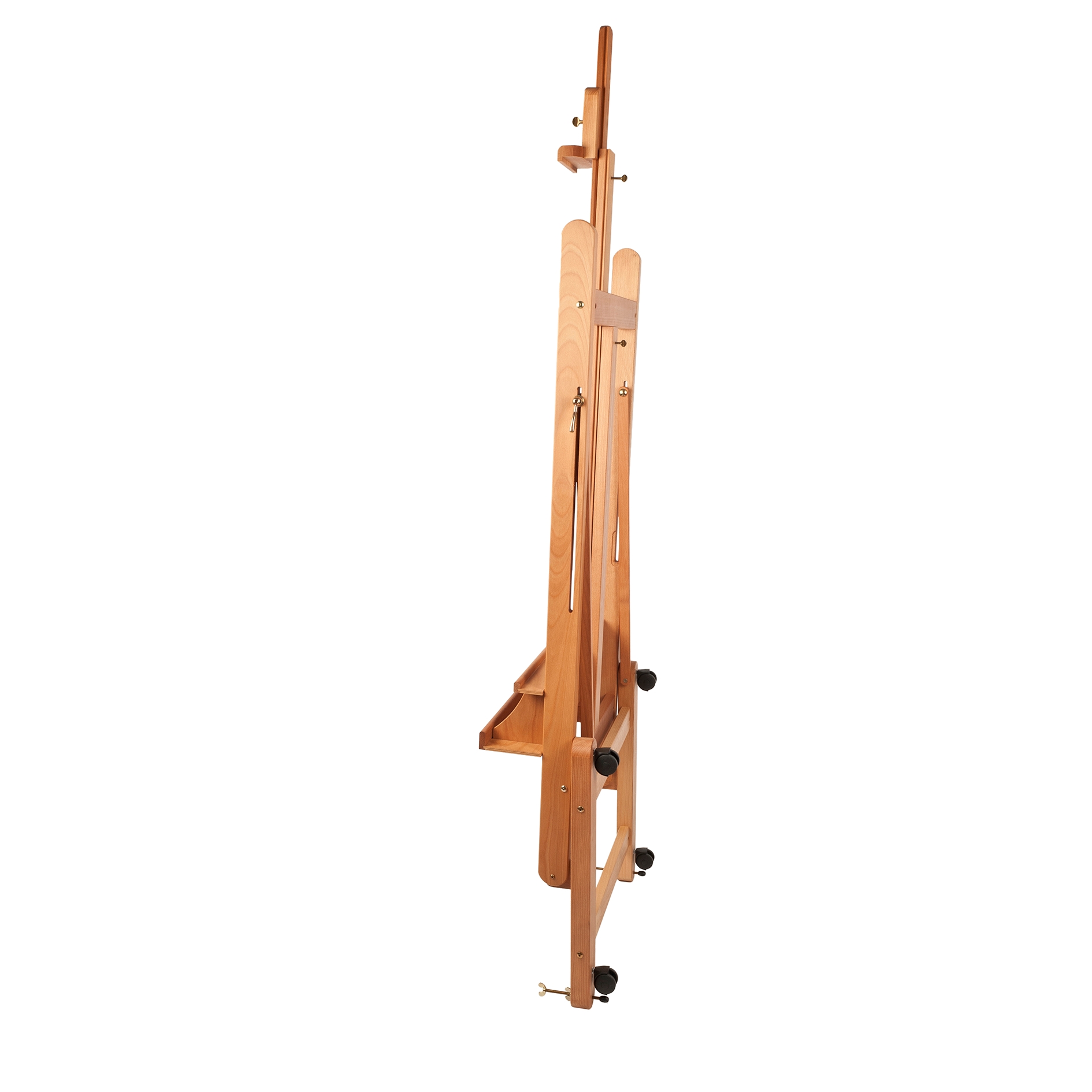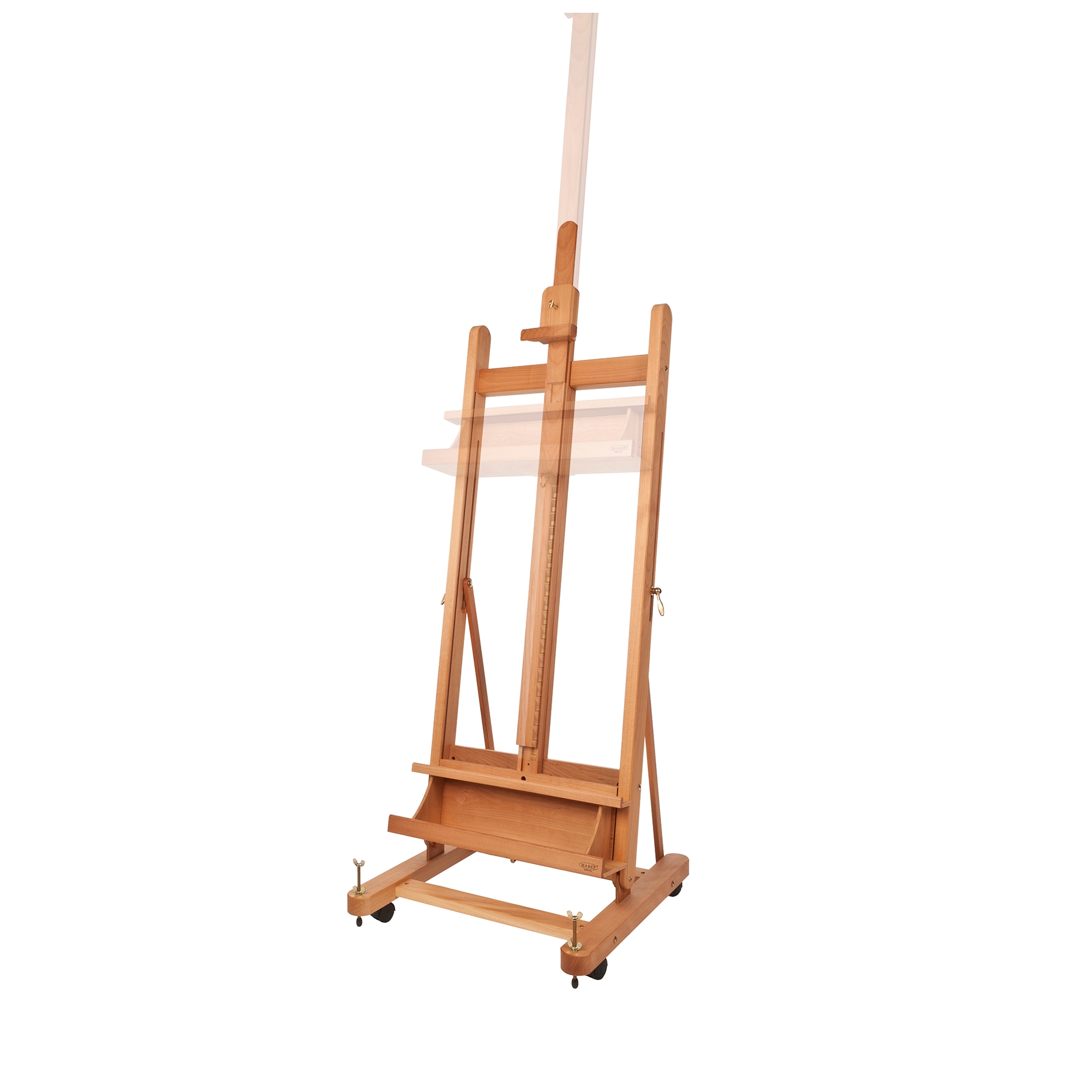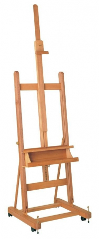 MABEF M-06 Studio Easels feature a variable length adjustment with simple ratchet action. Made from oiled beech wood, it has a sturdy base with 4 lockable casters. A storage area below the canvas ledge is perfect for tools, brushes and paints. The sturdy base supported by four casters and leveling bolts for easy movement and safe use. Overall height is 69 inches with a maximum canvas height of approximately 65 inches. Weighs 40 lbs. and is easy to assemble.
